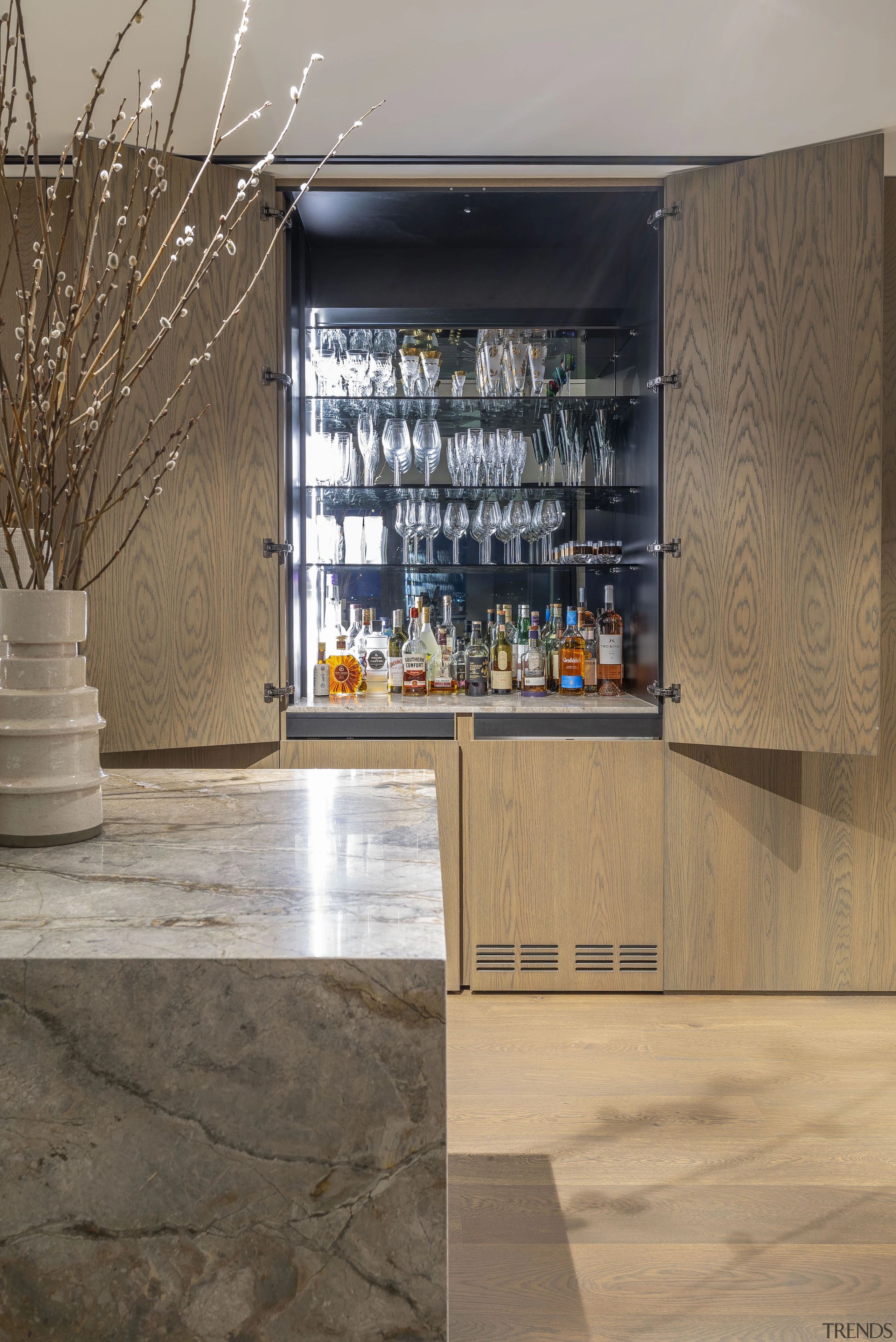 A drinks fridge, pull out drawers for glasses, smokey glass shelving, LED lighting and a full height smokey mirror splashback elevate the entertaining experience, while the stone bench top subtly keeps the bar connected to the kitchen’s aesthetics.